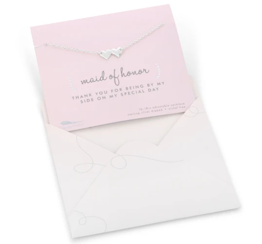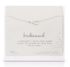 The Best Day Ever Bridal collection features nickel-free and sterling silver dipped charm necklaces with adjustable 16-18" chains. Pendant charms are about 1/2 in and fixed on the chain. Necklace comes packaged on giftable and sentimental card with miniature envelope.
